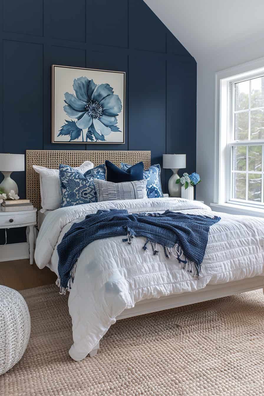 Opt for a darker blue behind the bed or in an alcove to create visual depth. This will make the room feel more intimate while maintaining a calming ambiance.